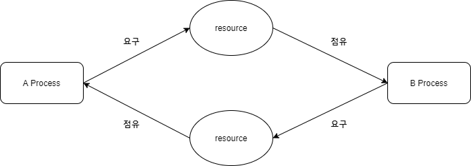- 서로 다른 둘 이상의 프로세스들이 상대 프로세스가 차지하고 있는 자원을 점유하기 위해 무한 대기하는 상태
