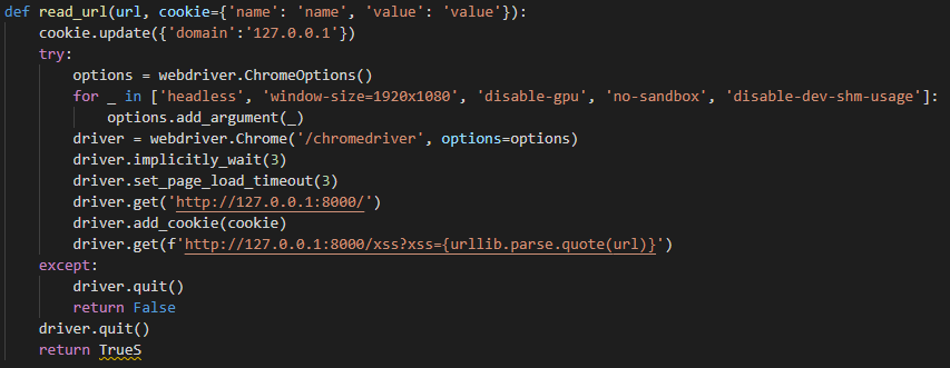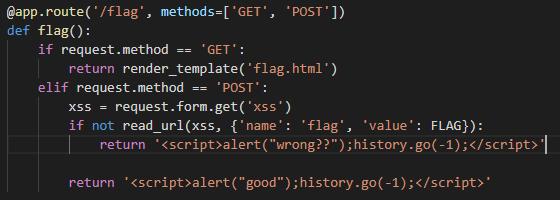 - read_url함수를 보면, FLAG가 포함된 쿠키를 생성하여 적용시킨다.