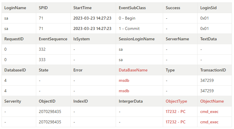SQL Server 감사 로그는 SQL Server 인스턴스에 대한 데이터 액세스 및 데이터 변경을 추적합니다. CLR 기능 악용에 관련된 쿼리 또는 이벤트를 찾을 수 있습니다. 사용자가 CLR 어셈블리를 생성, 변경 또는 삭제하는 경우 감사 로그에서 이를 확인할 수 있습니다. - Windows Event Log