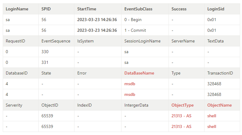 아래는 MS-SQL에서 CLR Store Procedutre를 통한 침해사고 발생 시 확인할 수 있는 이벤트 로그입니다.