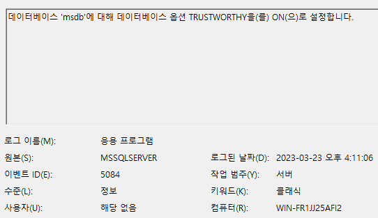해당 이벤트 로그는 특정 데이터베이스의 옵션을 변경할 때 발생합니다. 여기서 변경된 “TRUSTWORTHY” 속성은 SQL Server에서 사용되는 데이터베이스 설정 옵션입니다. 이 속성은 데이터베이스가 외부 리소스에 대한 액세스를 가질 때 시스템 리소스에 대한 높은 수준의 액세스 권한을 부여하는데 사용됩니다. 기본적으로 데이터베이스는TRUSTWORTHY 속성이 꺼져 있는 상태로 생성됩니다. 따라서, 공격자는 해당 옵션을 활성화하여 데이터베이스에 있는 코드 모듈(예: 저장 프로시저, 트리거, 사용자 정의 함수 등)이 높은 권한으로 실행되어 시스템 리소스에 액세스할 수 있게 됩니다.