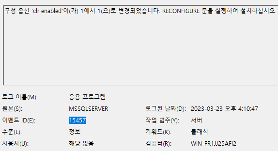 Event ID : 15457 - 구성 옵션 ‘%1’이(가) %2에서 %3(으)로 변경되었습니다. RECONFIGURE 문을 실행하여 설치하십시오.