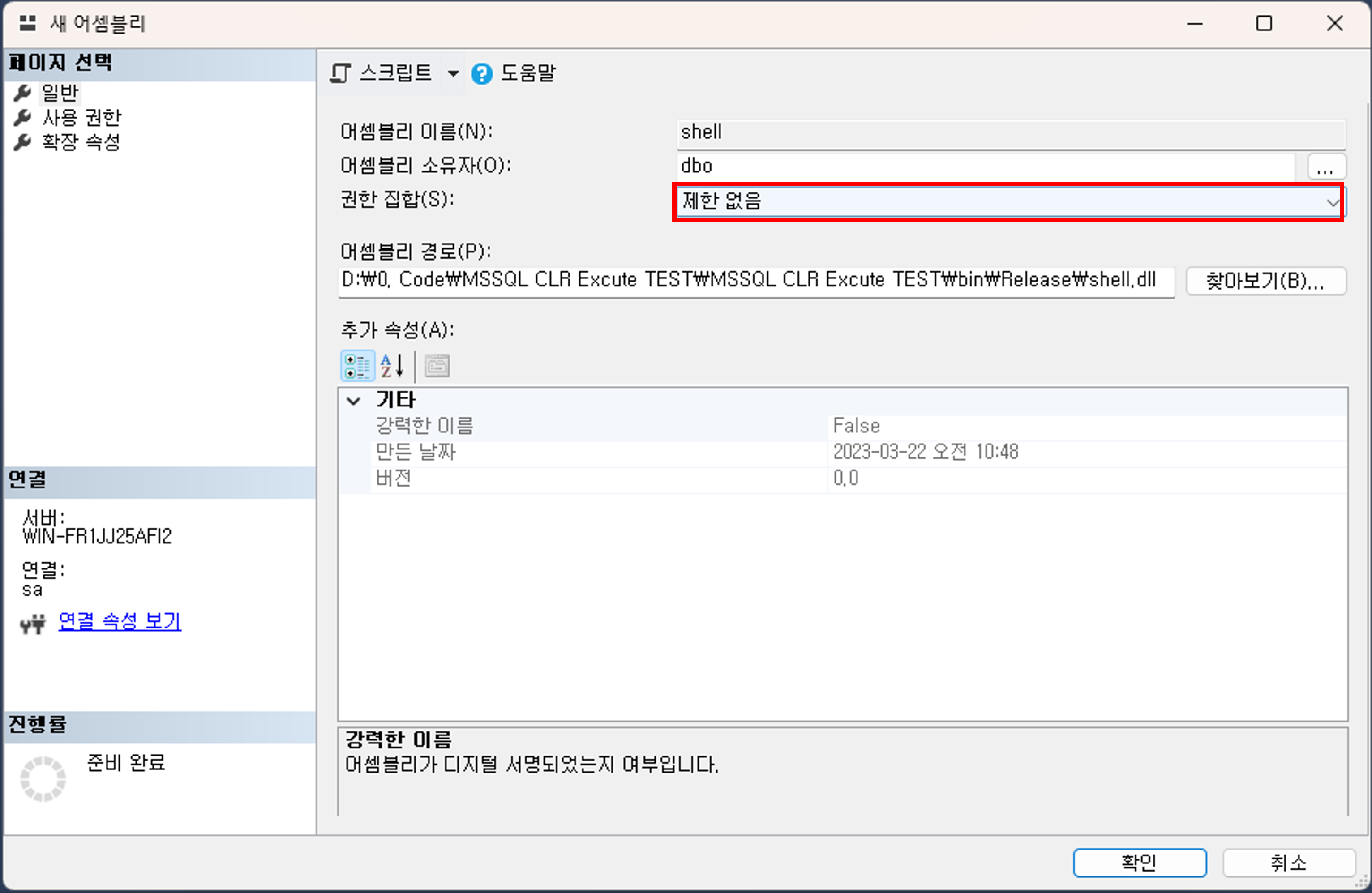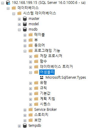 이후, msdb 데이터베이스를 대상으로 앞서 컴파일한 DLL을 Import 합니다.