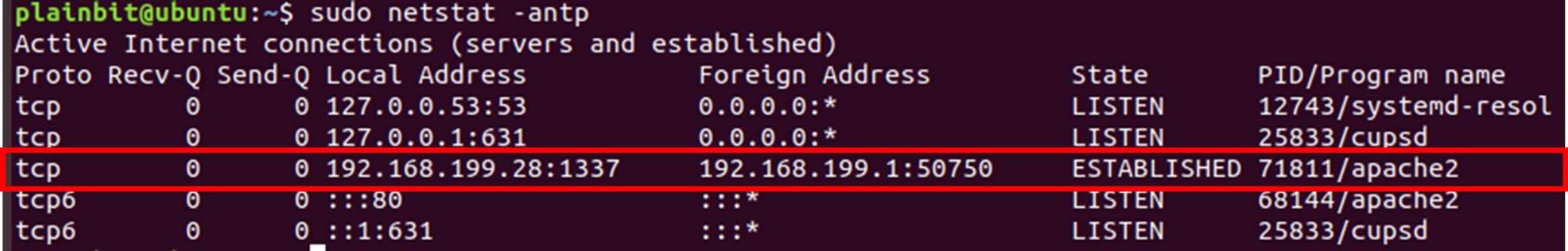 Bind Shell의 경우, Vicitim에서 연결을 기다리는 상태로 활성화 이후 연결이 되기전까지 apache 프로세스가 특정 포트를 오픈하고 대기하는 상태가됩니다. 아래는 **netstat -antp** 명령어 결과입니다.