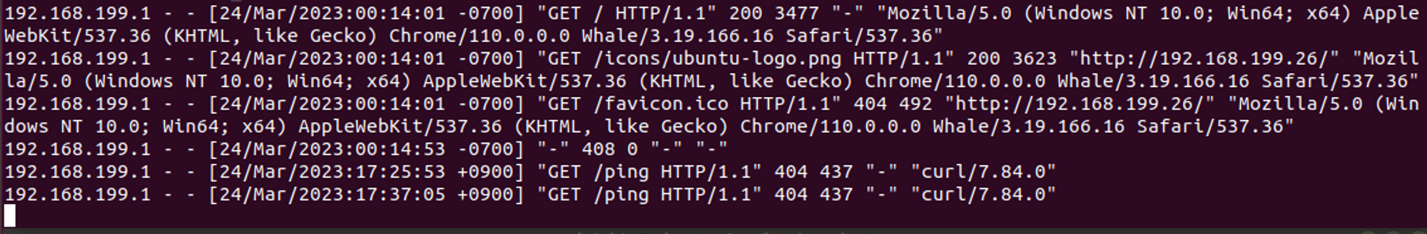 192.168.199.1 - - [24/Mar/2023:00:14:01 -0700] "GET /icons/ubuntu-logo.png HTTP/1.1" 200 3623 "<http://192.168.199.26/>" "Mozilla/5.0 (Windows NT 10.0; Win64; x64) AppleWebKit/537.36 (KHTML, like Gecko) Chrome/110.0.0.0 Whale/3.19.166.16 Safari/537.36"