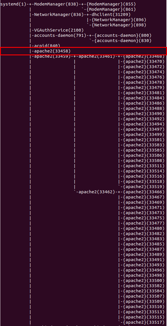 **root 33458 1 0 17:33 ? 00:00:00 /usr/sbin/apache2 -k start**