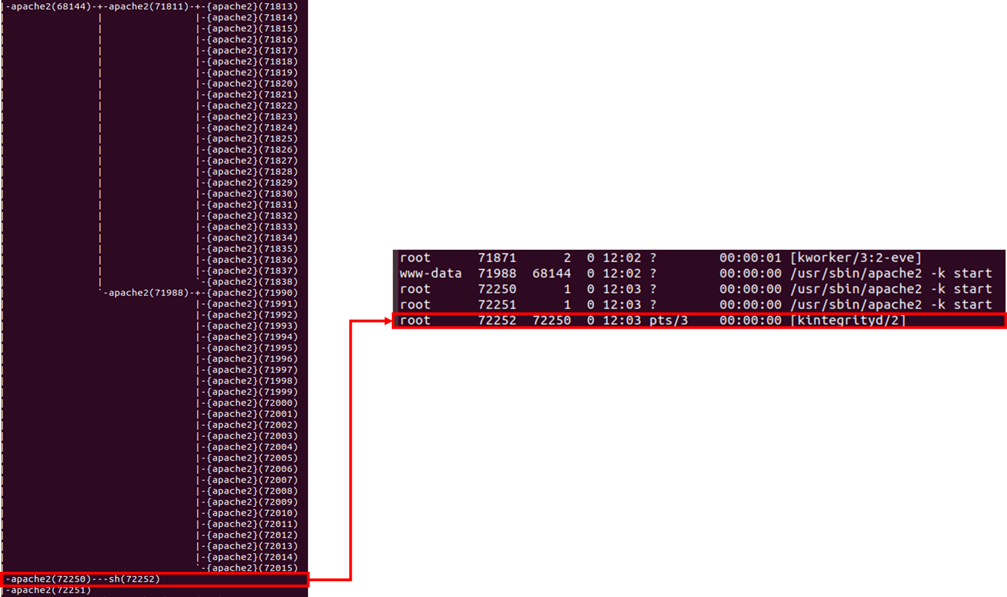 연결에 성공한 경우, 새로운 apache 프로세스가 생성되며, “kintegrityd”으로 위장된 bash 셸이 생성되게 됩니다.